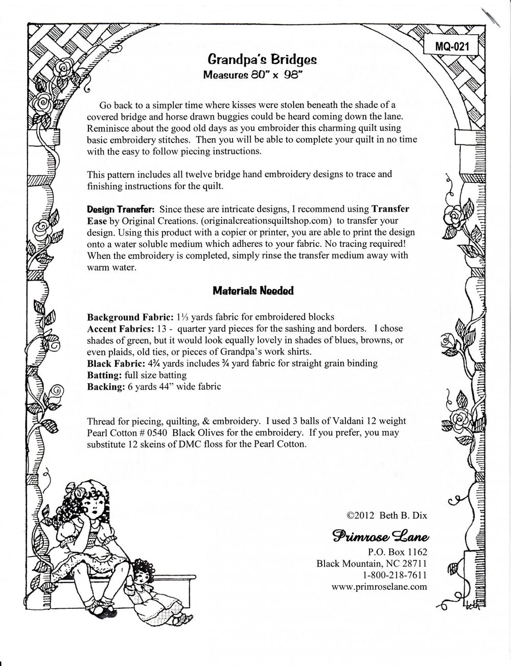 Go back to a simpler time where kisses were stolen beneath the shade of a covered bridge and horse drawn buggies could be heard coming down the lane. Reminisce about the good old days as you embroider this charming quilt using basic embroidery stitches. Then you will be able to complete your quilt in no time with the easy-to-follow piecing instructions.