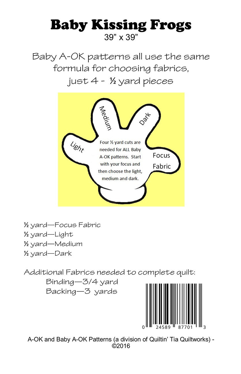 Quilt measures 39in x 39in Crazy name, but an easy and stunning quilt. If you squint and look, maybe you will see the frogs kissing! Every Baby A OK pattern uses just four 1/2 yard cuts of fabric 1/2 yard of a theme print, then 1/2 yard of a light, medium, and dark. Any bundle that is chosen using the formula will work with any Baby A OK pattern (3 pages).