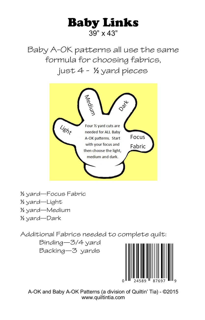 Quilt measures 39in x 43in Strip pieces block design makes for a fast and easy baby quilt. A feature print shines as the border, while the light, medium and dark do the work of contrast in the center. Every Baby A OK pattern uses just four 1/2 yard cuts of fabric 1/2 yard of a theme print, then 1/2 yard of a light, medium, and dark. Any bundle that is chosen using the formula will work with any Baby A OK pattern (4 pages).