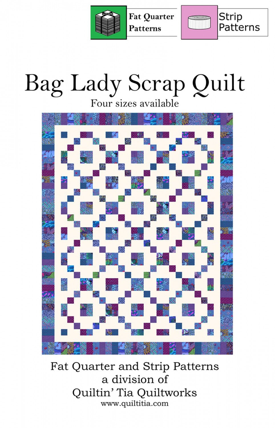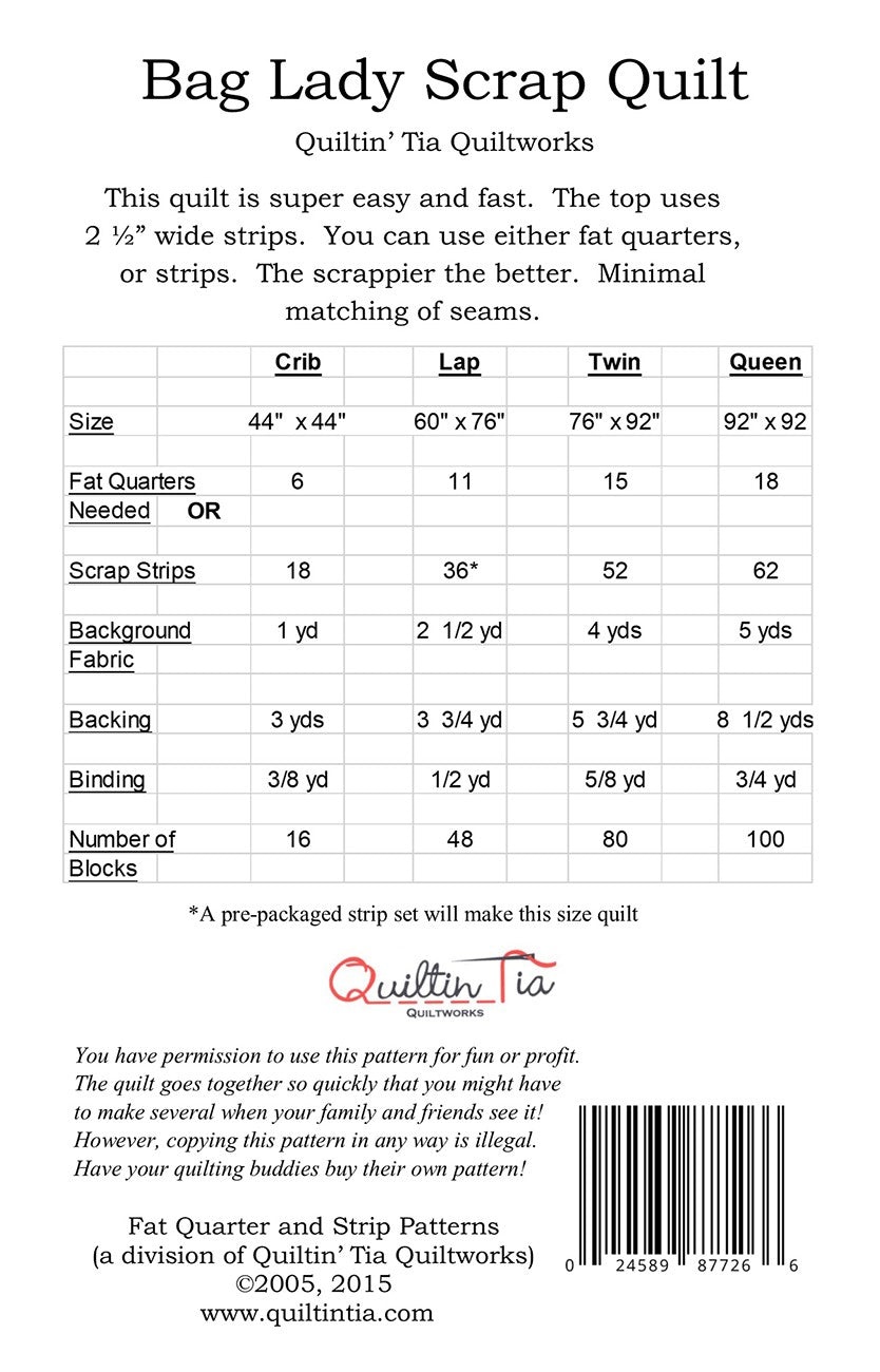 Four sizes available, one pre packaged strip pack of 40 strips will make the Lap size (60in x 76in) Use a group of fat quarters or a bundle of 2 1/2in strips to create a gorgeous quilt. Throw all the stirps into a paper bag and pull as you go. Great way to reduce matching stress. An additional fabric is added for the background, making this a great pattern to kit. All pages printed in COLOR (5 pages).