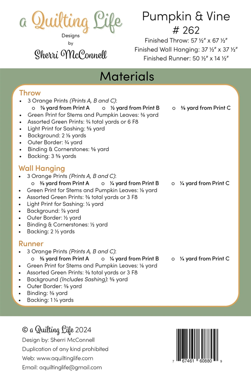 The Pumpkin & Vine pattern contains three projects, a lap/throw quilt, a wall hanging, and a table runner option. Strip piecing makes this design quick and easy to put together.