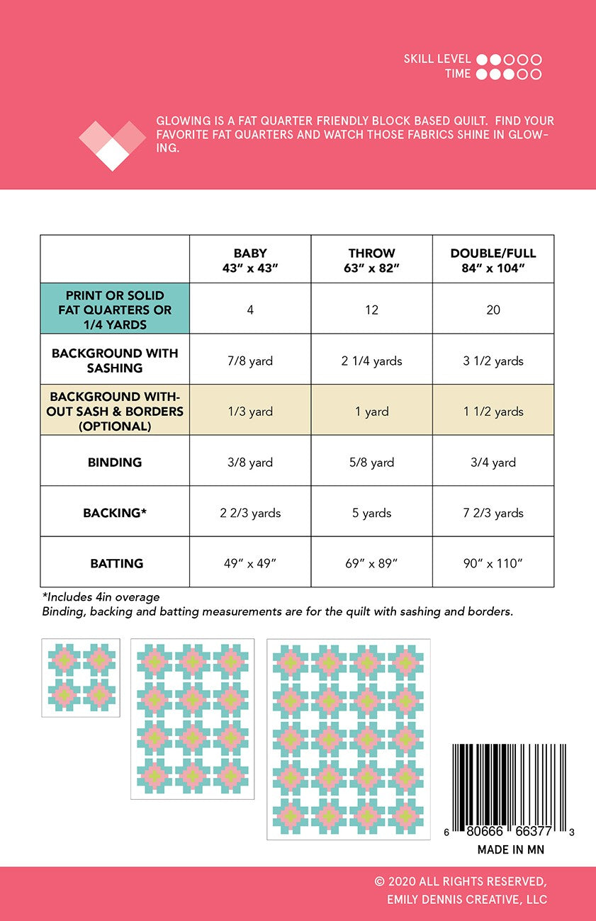 Glowing is a fat quarter friendly quilt pattern. Use fat quarters or 1/4 yards for this bold block based quilt pattern. Includes 3 size options: Crib, Throw and Full/ Double size.