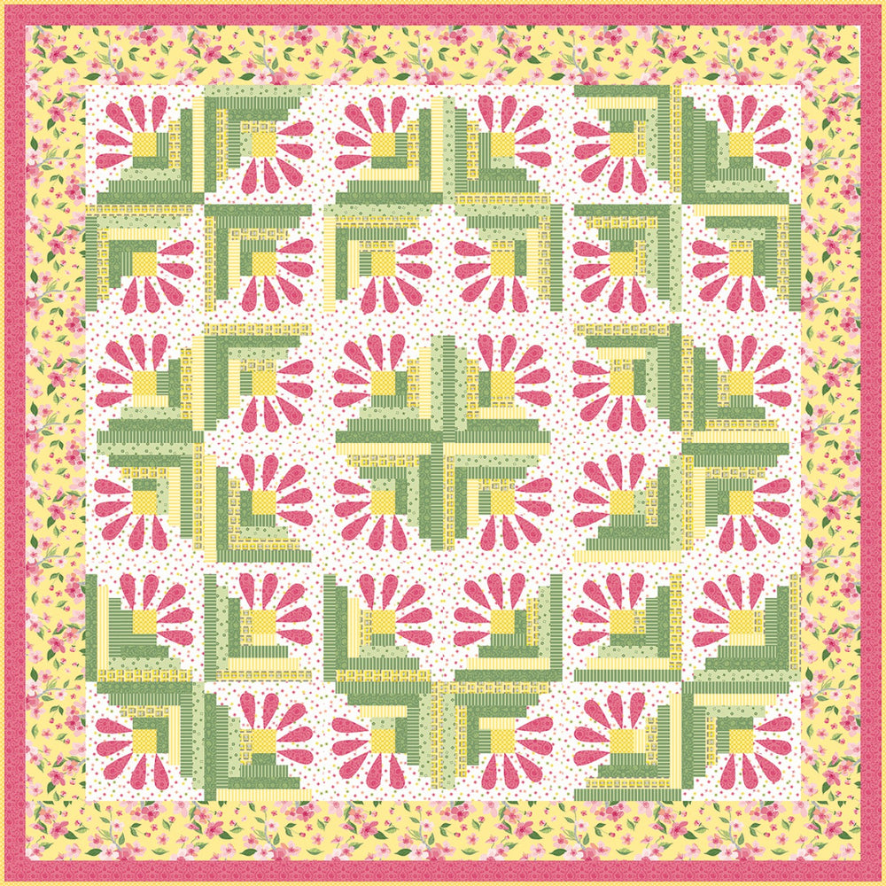 The Coneflower Corner Quilt by Jill Finley of Jillily Studio features a block with applique on one side and log cabin pieced strips on the other side.