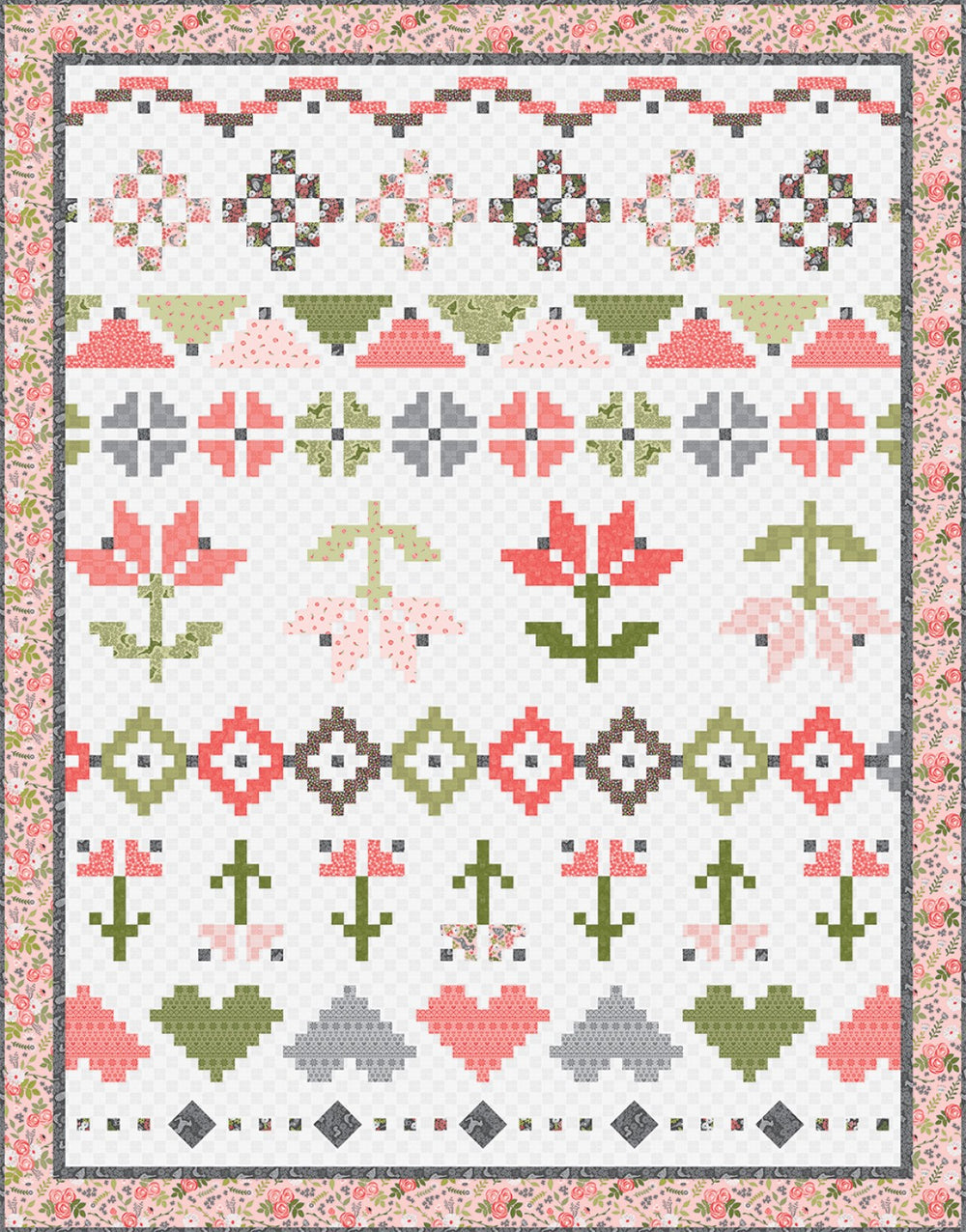 The Knitted Row-Along Sew-Along Quilt by Jill Finley of Jillily Studio features pieced rows of blocks that create a knit-like design. Finished size is 79" x 101".