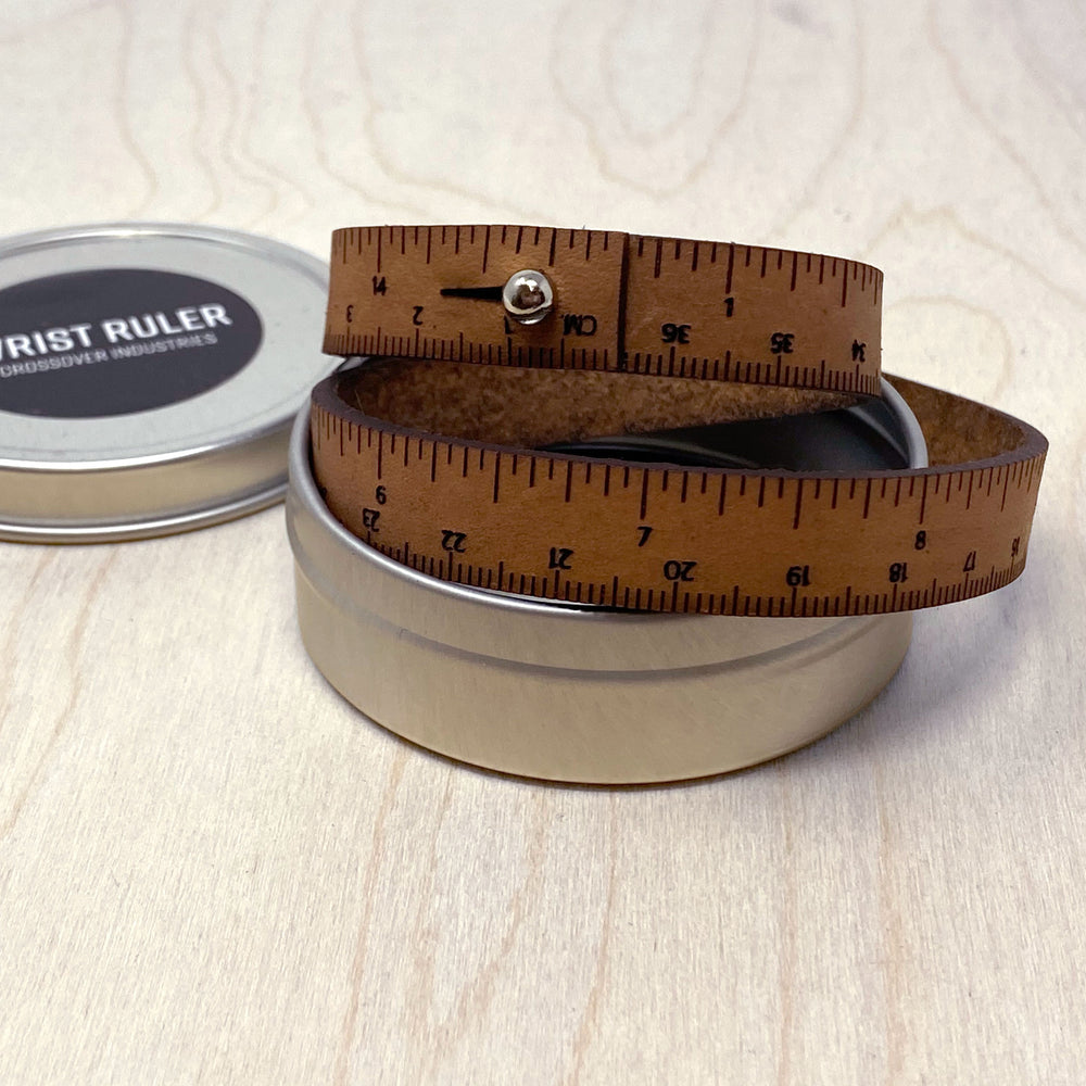 Sizes are based on wrapping around your wrist twice. Give it extra length depending on how loosely you want to wear it. Please allow an extra 1/2 inch for the stud closure. Wrist Ruler is made in the US.