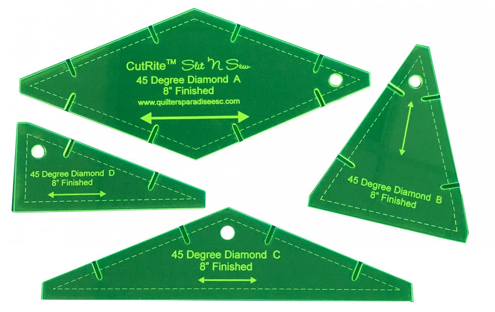 Slit 'N Sew templates represent a truly revolutionary improvement by allowing piecing to be done quickly and easily each and every time! Simply use a rotary cutter to make small cuts that are precisely located on the templates. Then proceeding a slit at a time, line up the next slit from each piece that is being pieced together and sew to that slit. The result? A perfect piecing job in no time!