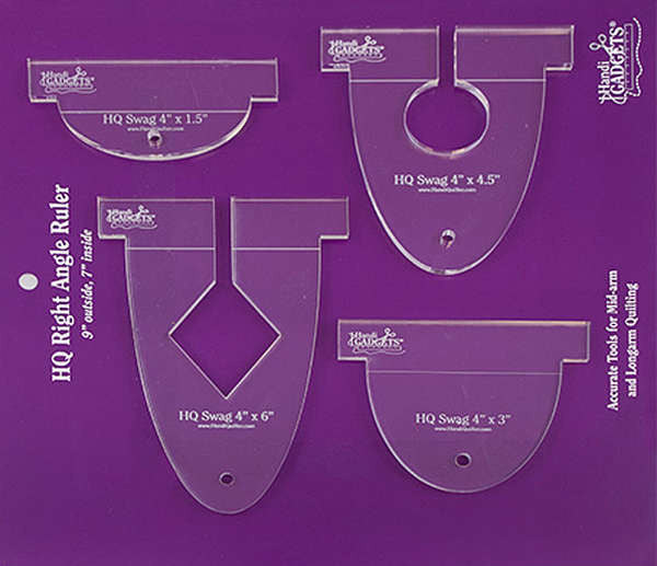 Set of four nesting swag rulers: 4in x 1.5in, 4in x 3in, 4in x 4.5in, 4in x 6in. BONUS: Circle and Diamond designs. Swag Templates for quilted swags in borders. Packaging includes instructions for use, safety tips and design ideas. Template is 1/4in thick.