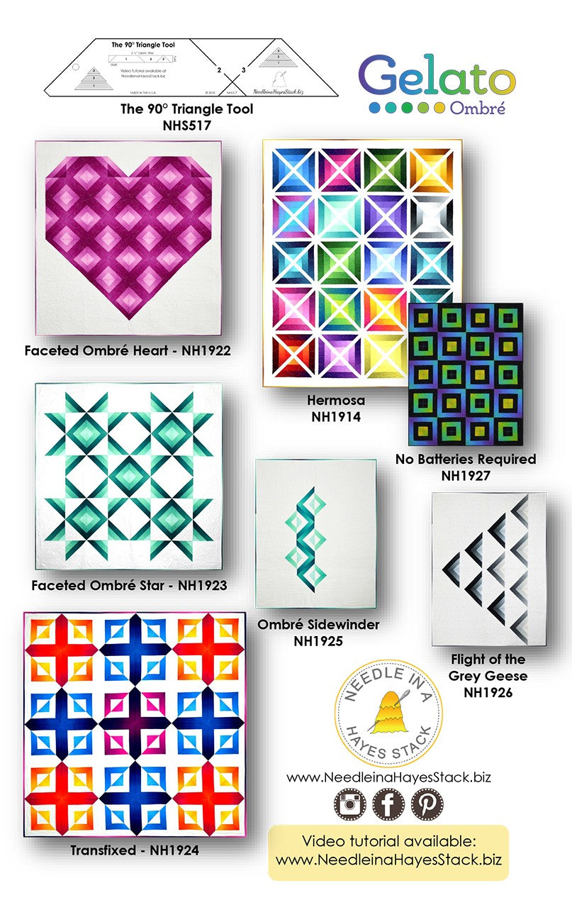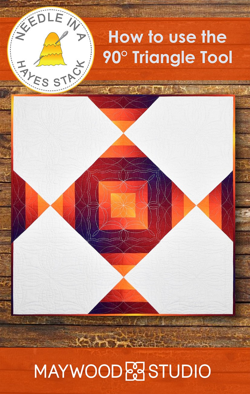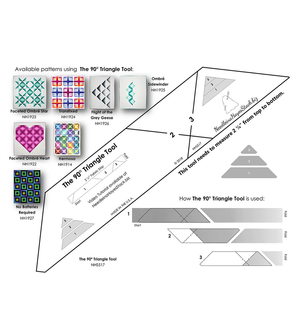 The 90 Degree Triangle Tool is designed to work with Ombre fabrics. The tool aids in cutting the ombre into gradient pieces to assemble 90 triangles.