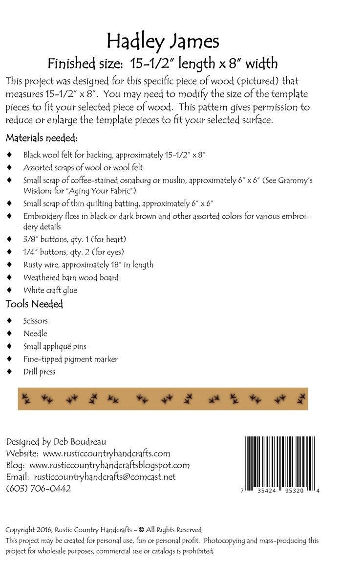 Hadley James is a snowman peeking out from a crazy quilted mitten made from scraps of recycled wool and embellished with Warm Winter Welcome and embroidery. He is mounted on a piece of rustic and weathered barn wood. Finished size 15-1/2in x 8in
