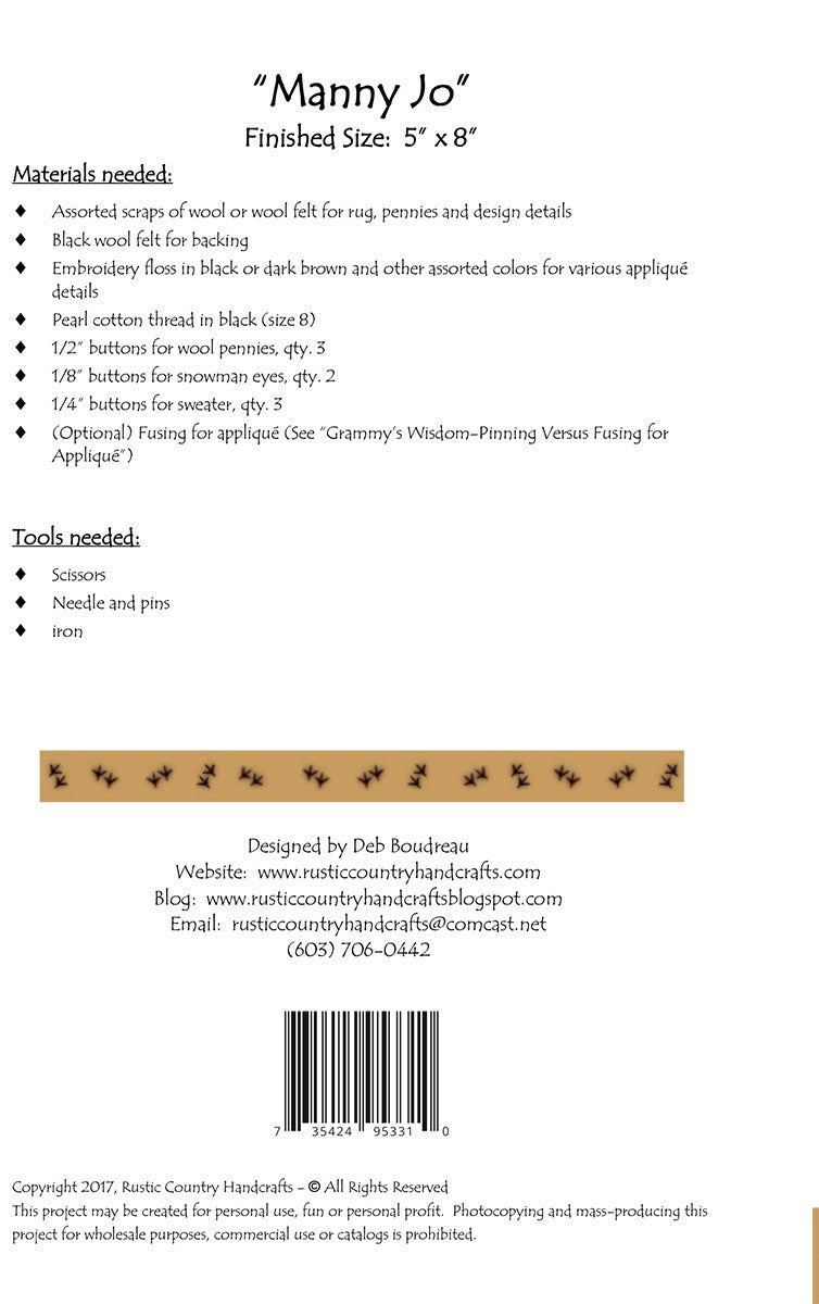 Manny Jo is a cute little wool penny mug rug featuring an appliqued sitting snowman all bundled up for the winter season. The rug can be used on a desk at work for coffee or with a candle. Finished rug is 5in x 8in.