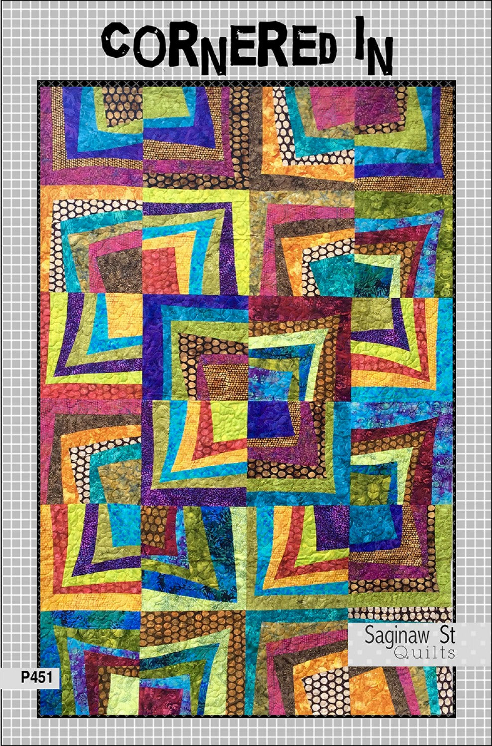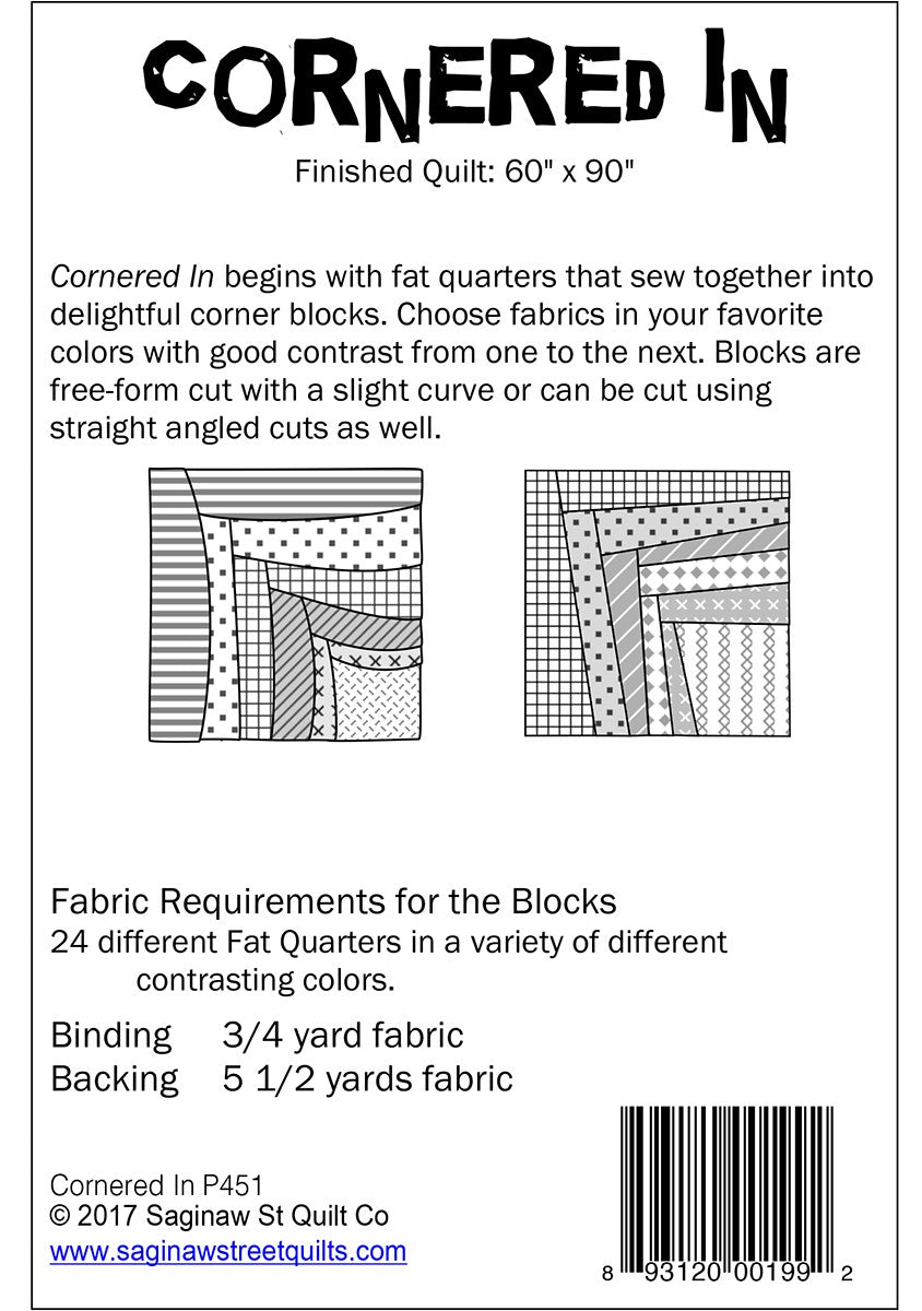 Cornered In begins with fat quarters that sew together into delightful corner blocks. Choose fabrics in your favorite colors with good contrast from one to the next. Blocks are free-form cut with a slight curve or can be cut using straight angled cuts as well.