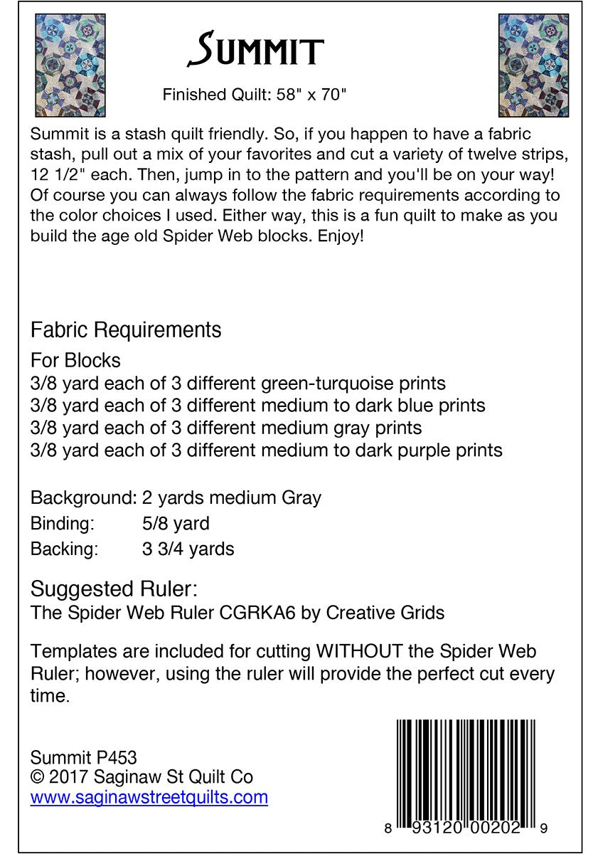 Finished Size: 58in x 70in Summit is a stash quilt friendly. So, if you happen to have a fabric stash, pull out a mix of your favorites and cut a variety of twelve strips, 12-1/2in each. Then, jump in to the pattern and you'll be on your way! Of course you can always follow the fabric requirements according to the color choices I used. Either way, this is a fun quilt to make as you build the age old Spider Web blocks. Enjoy!