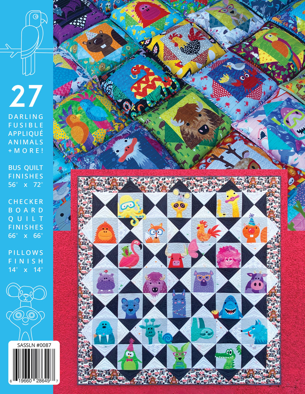 The book includes a quilt pattern featuring all the animals rolling through town on a tall bus, a quilt incorporating the animals with quarter-square triangles and a fun pieced pillow pattern that focuses on each animal. These critters are the same size and play nicely with