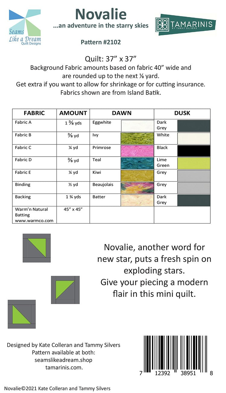 A new star explodes across the surface of this modern wall quilt, with floating elements that create negative space perfect for experimenting with quilting motifs. The pattern combines basic units such as flying geese, half square triangles, and framed squares. Two colorways are shown on the pattern, making it a great project to explore color and value. Quilt finishes at 37" x 37”.