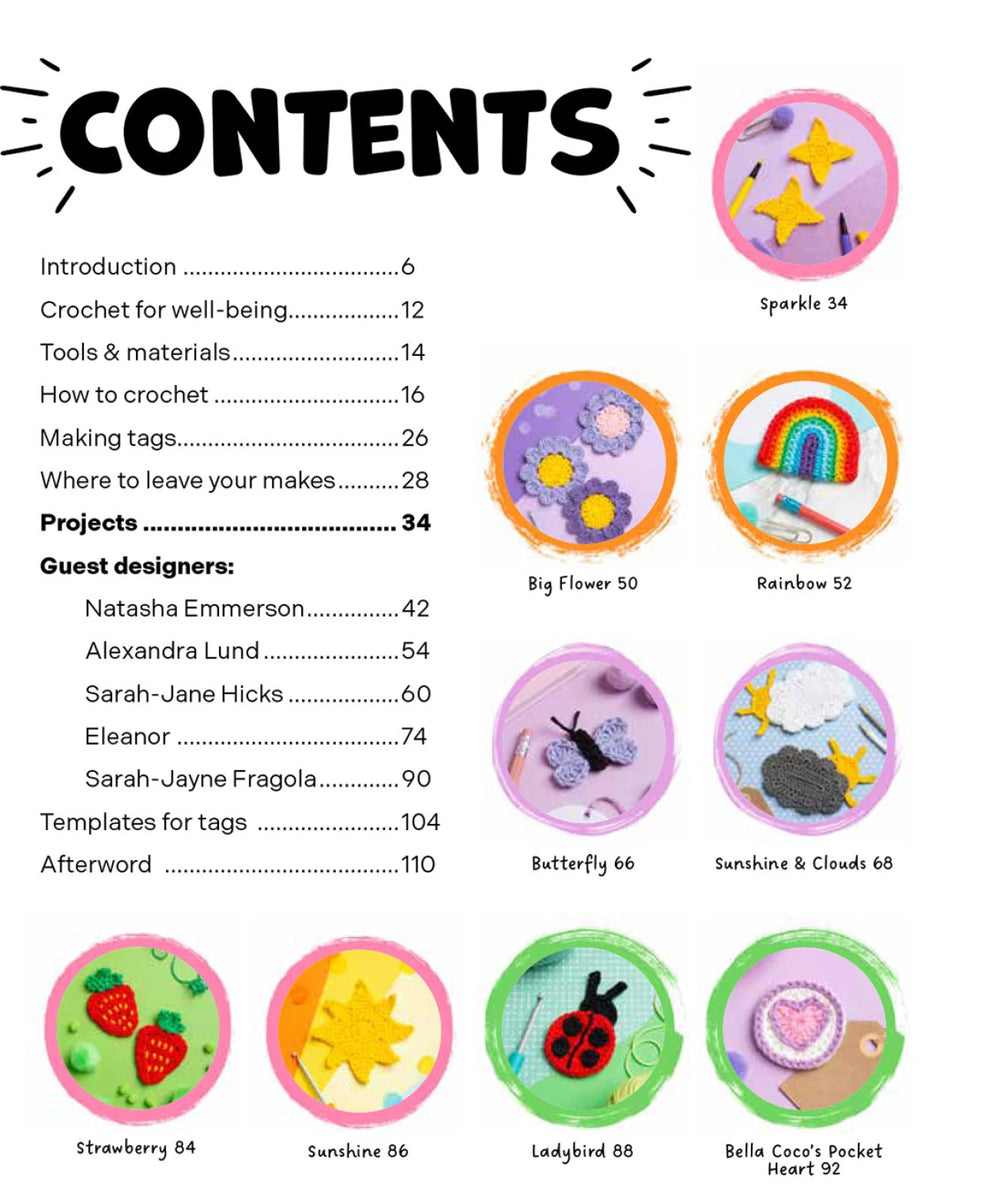 • 25 crochet patterns: a range of quick makes that you can create in under an hour, including flowers, rainbows, stars, hearts, smiley faces, a sunshine, and more