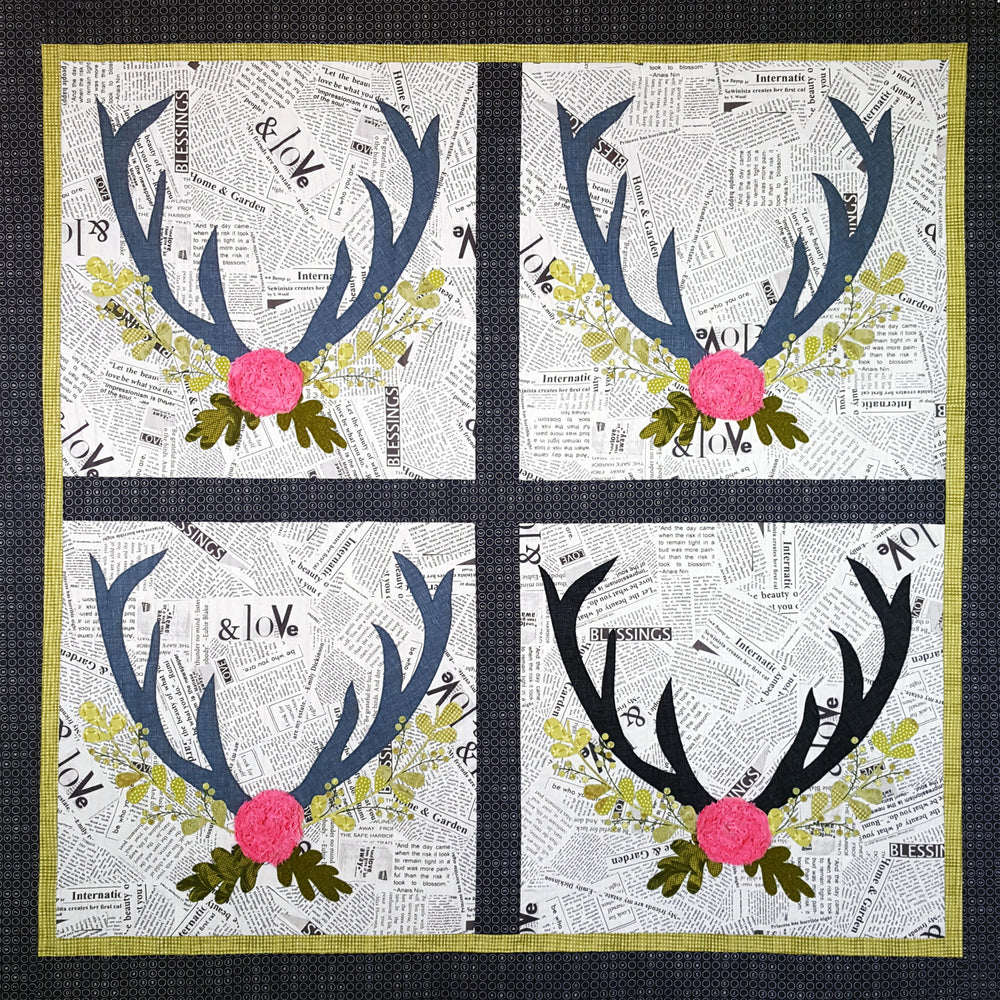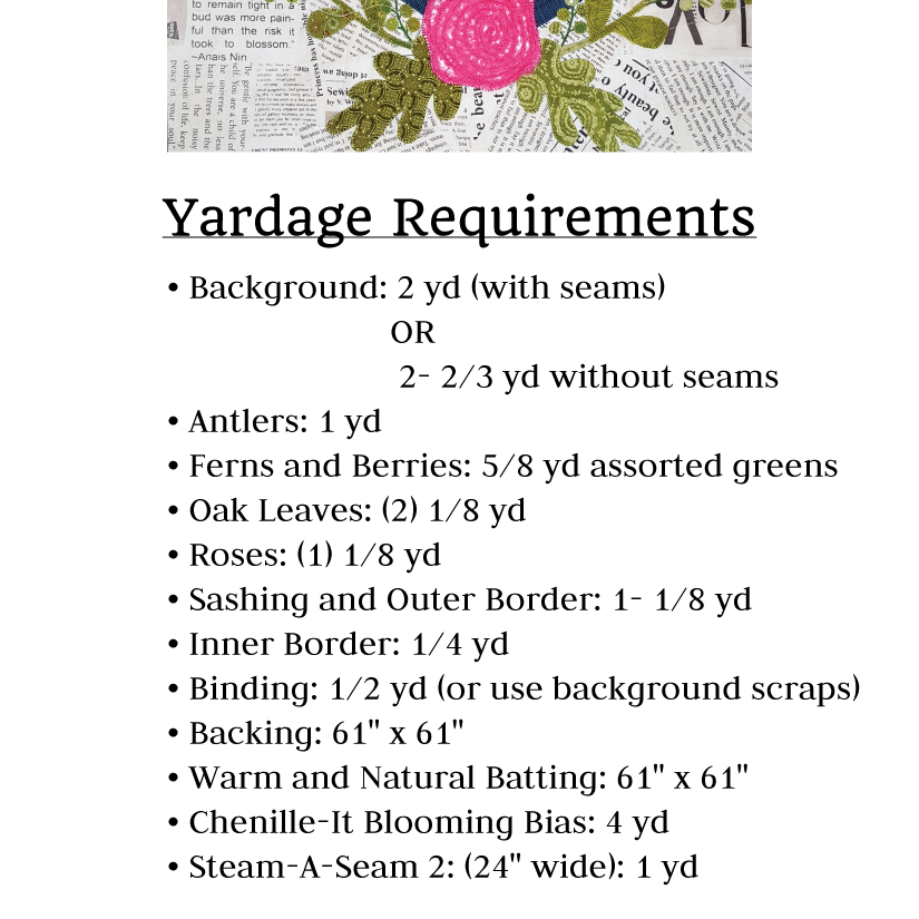 Show off your love of nature with this fabric bouquet of antlers, leaves, roses and berries. Chenille-It Blooming Bias is used to give the roses a lovely and unexpected texture.