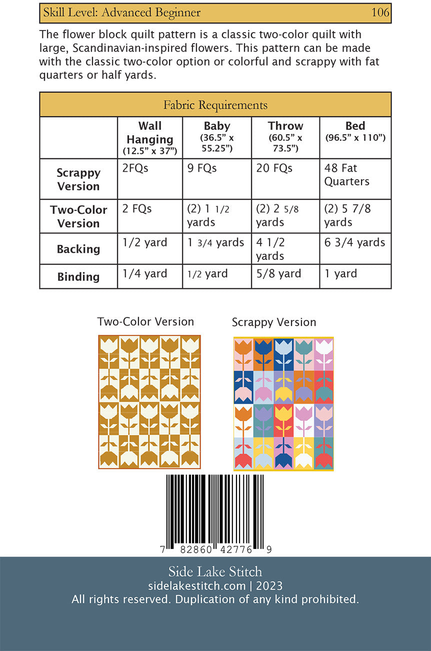 The flower block quilt pattern is a classic two-color quilt with large, Scandinavian-themed flowers.