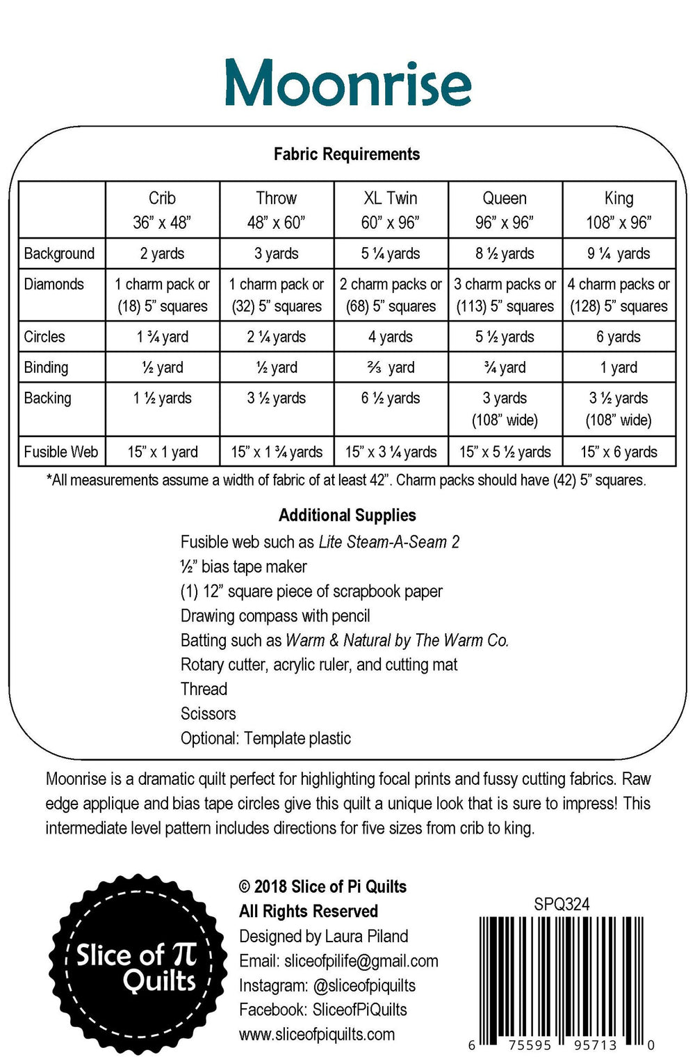 Moonrise is a dramatic quilt perfect for highlighting focal prints and fussy cutting fabrics. Raw edge applique and bias tape circles give this quilt a unique look that is sure to impress! This intermediate level pattern includes directions for five sizes from crib to king.