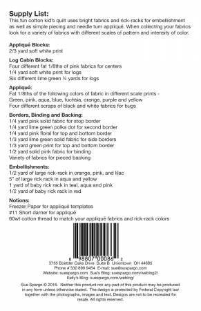 This fun cotton quilt uses bright fabrics and rick-racks for embellishment as well as simple piecing and needle turn applique.
