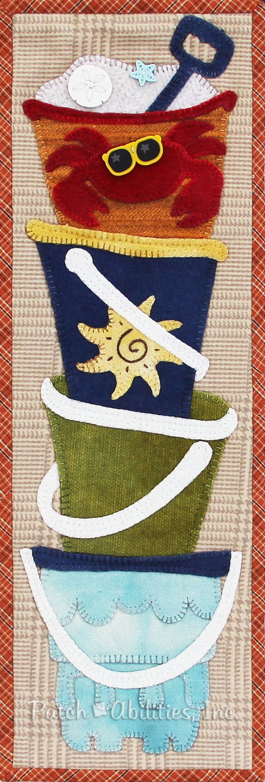 This pattern is called Beach Day and it features a cute stack o' sand pails. It's the July pattern for Monthly Mini Series#11. This applique pattern includes complete quilting and binding instructions! It's the PERFECT one-day quilting project!