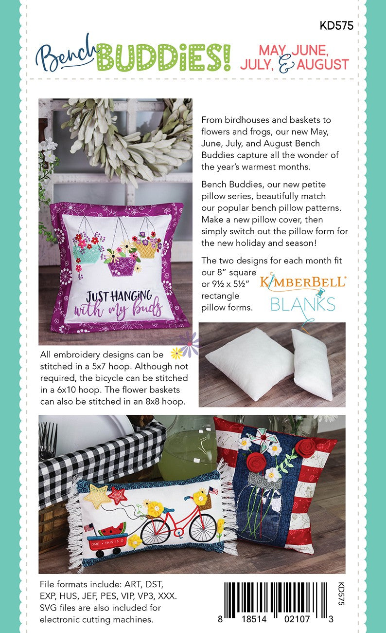 Bench Buddies, our petite pillow series, beautifully match our popular bench pillow patterns. Make a new pillow cover, then simply switch out the pillow form for the new holiday and season! The two designs for each month fit our 8” square or 9 ½” x 5 ½” rectangle pillow forms, with all embroidery stitched within a 5”x 7” hoop. Although not required, the bicycle can be stitched in a 6x10 hoop. The flower baskets can also be stitched in an 8x8 hoop. Choose complementary fabrics and stitch the pillows as a coordinating set to create lovely décor for benches, shelves, and more!