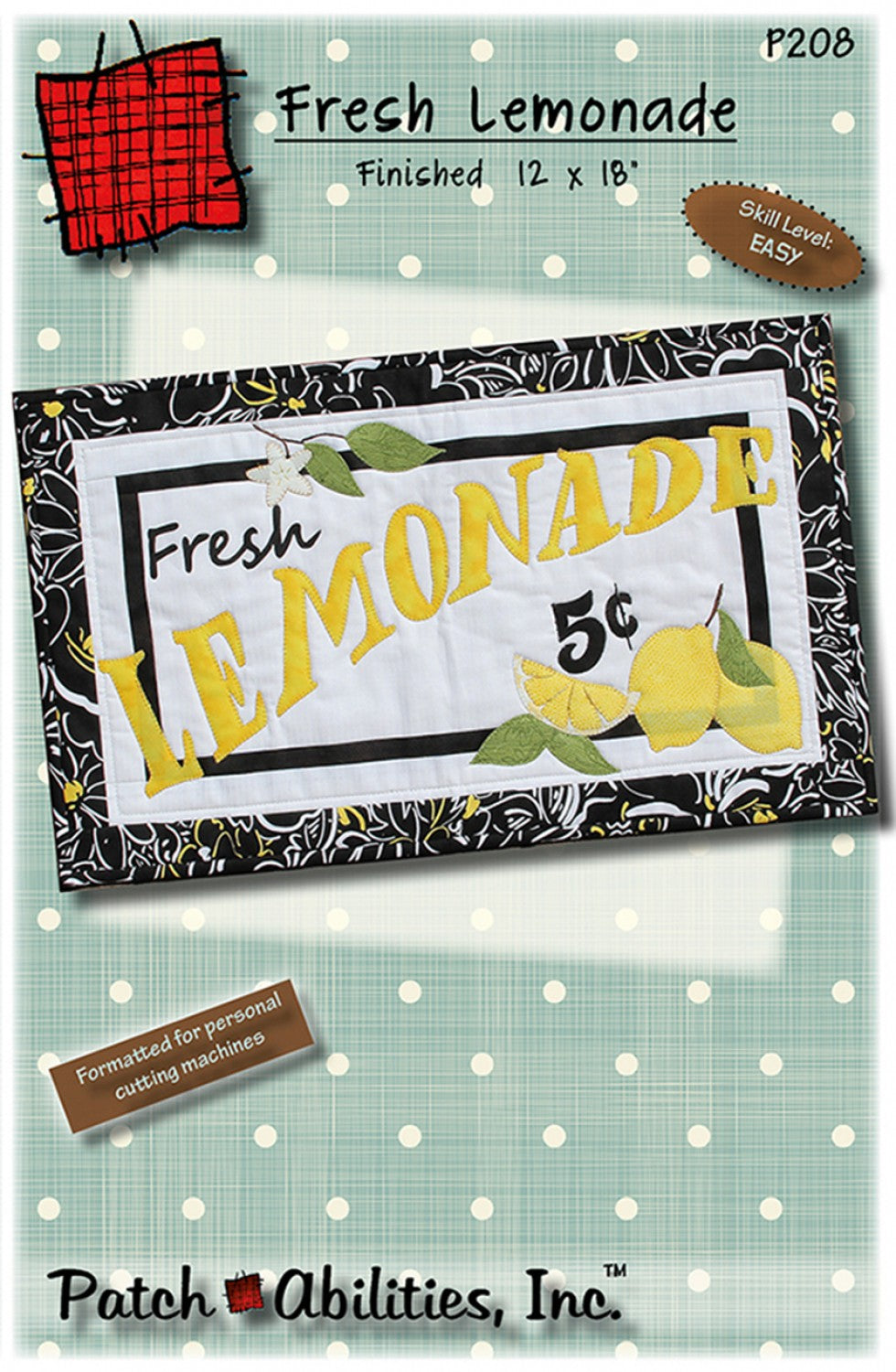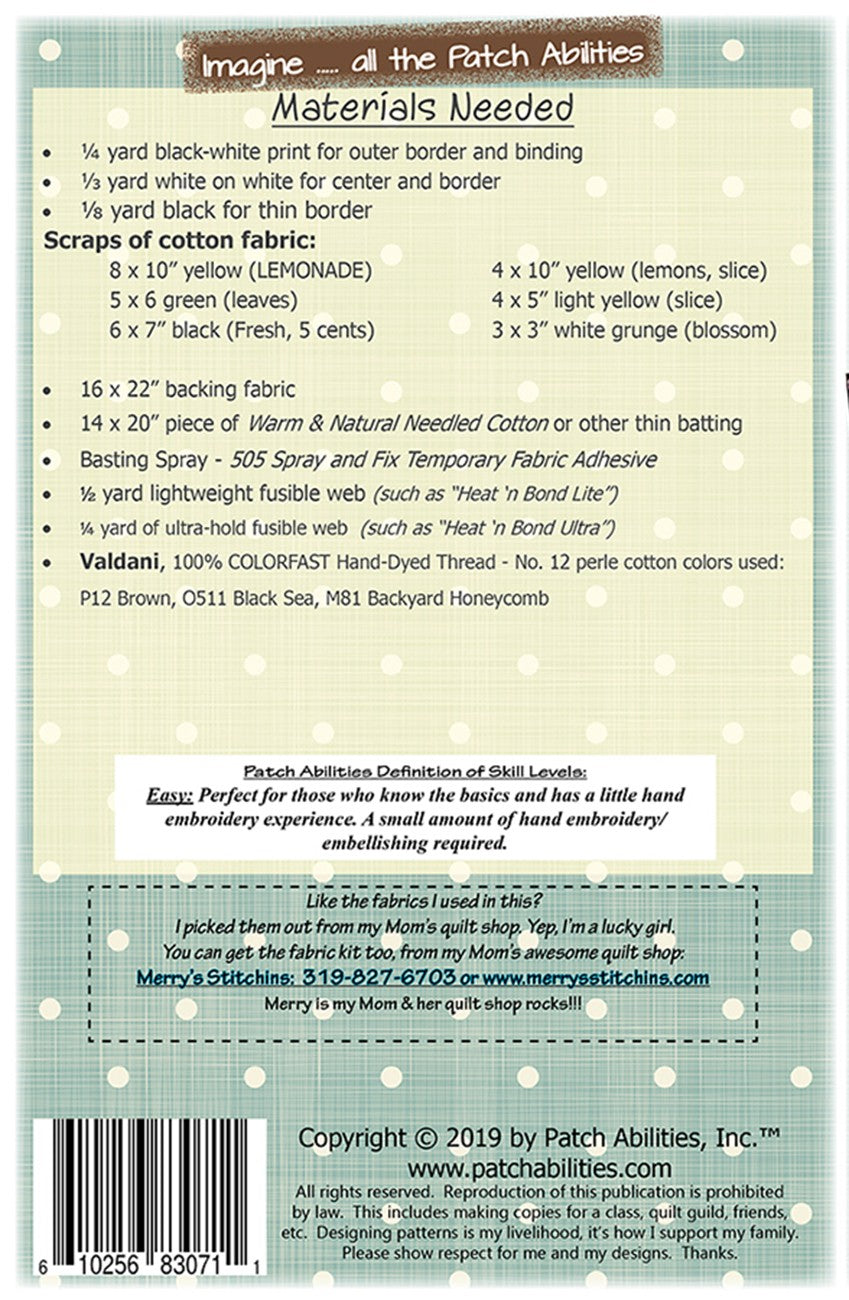 Finished size 12 x 18 in. Make mouthwatering handmade lemonade applique home decor with this quilt pattern. Whether you make this a wall decor, lemonade table centerpiece or lemon placemats, it will compliment and refresh your Farmhouse decor, modern or simply lived in home. Design features 5 cent Lemonade, lemon slice, lemons, lemon branch and lemon blossom. Beginners learning how to piece, machine quilt and bind. Pattern includes beginner tips and complete binding instructions. Skill level is Easy with just a smidge of embroidery details to add.
