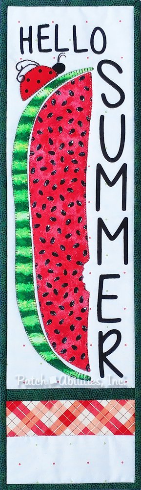 Long skinny quilted summer wall hanging featuring watermelon and ladybug, and picnic table cloth resembling strip in the background.