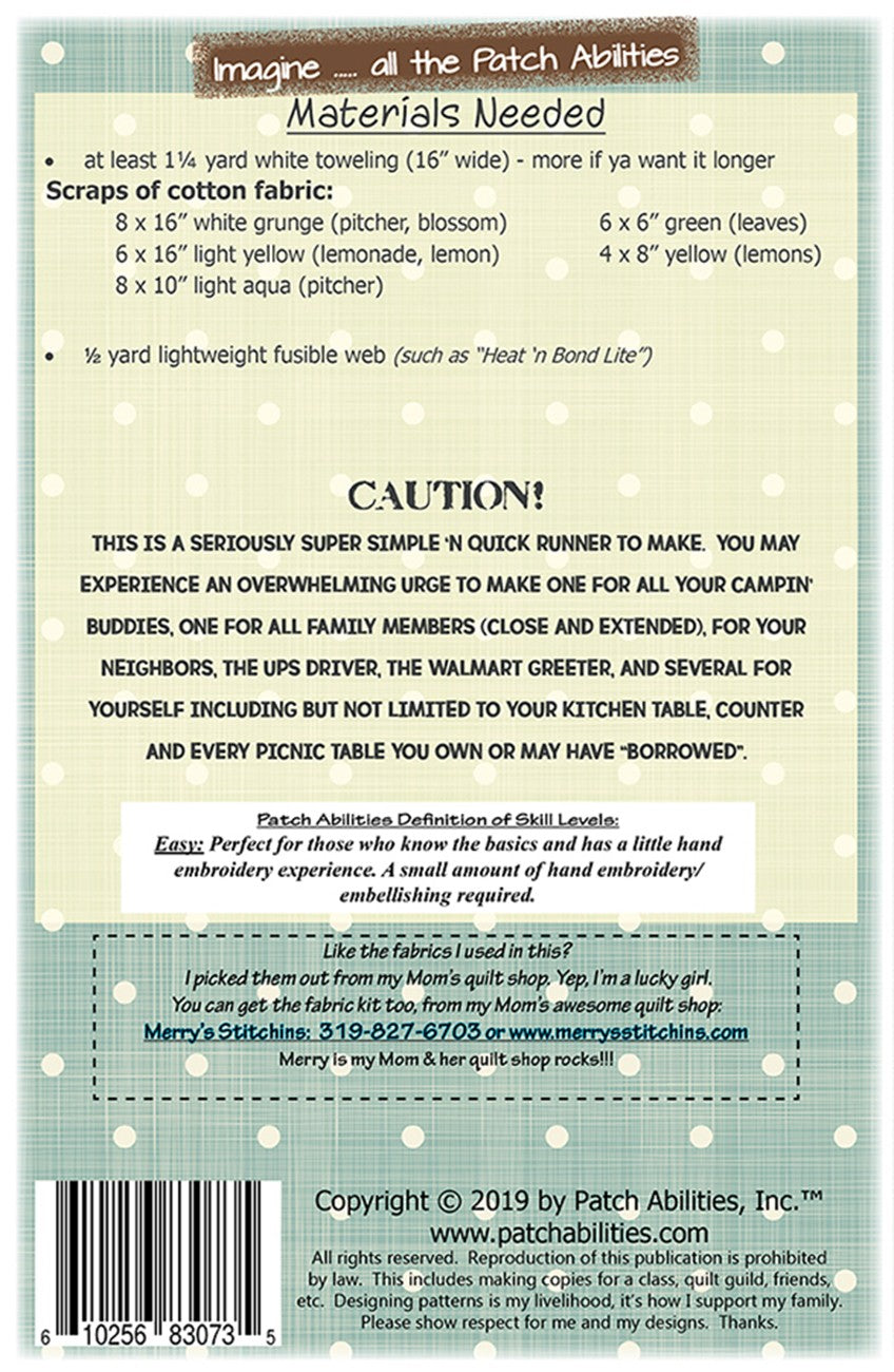 This pattern has you stitching up a DIY lemonade towel, runner or placemats in no time! Especially if you use Moda Toweling, old fashion cotton toweling by the yard that comes hemmed on both sides. Super easy to machine applique the words Ice Cold Lemonade and lemon with lemon branch with the simplified templates. Put a splash of fresh lemons into your Farmhouse decor!
