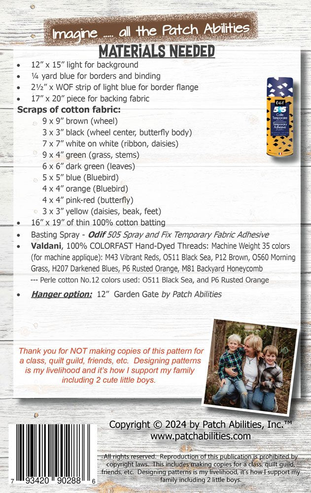 A nostalgic wall hanging featuring an antique wagon wheel among the daisies, butterfly and bluebird. Project uses traditional raw edge applique with fusible web.