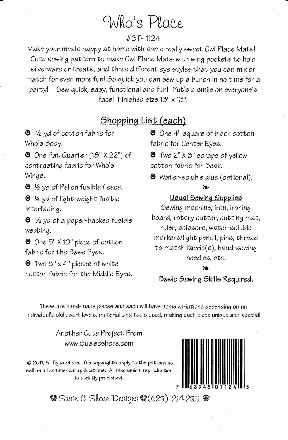 Cute sewing pattern to make Owl Place Mats with wing pockets to hold silverware or treats, and three different eye styles that you can mix or match for even more fun! So quick you can sew up a bunch in no time for a party! Sew quick, easy, functional and fun! Puts a smile on everyone's face!