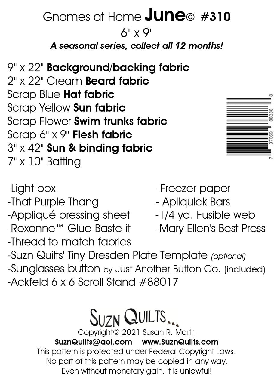 Gnomes At Home is an adorable 12 pattern seasonal series that will make a fun monthly club for your shop. Pattern includes detailed Tiny & Mini Dresden plate assembly instructions for beard & tail as well as full-size, reversed, appliqué templates and a full-size assembly diagram.