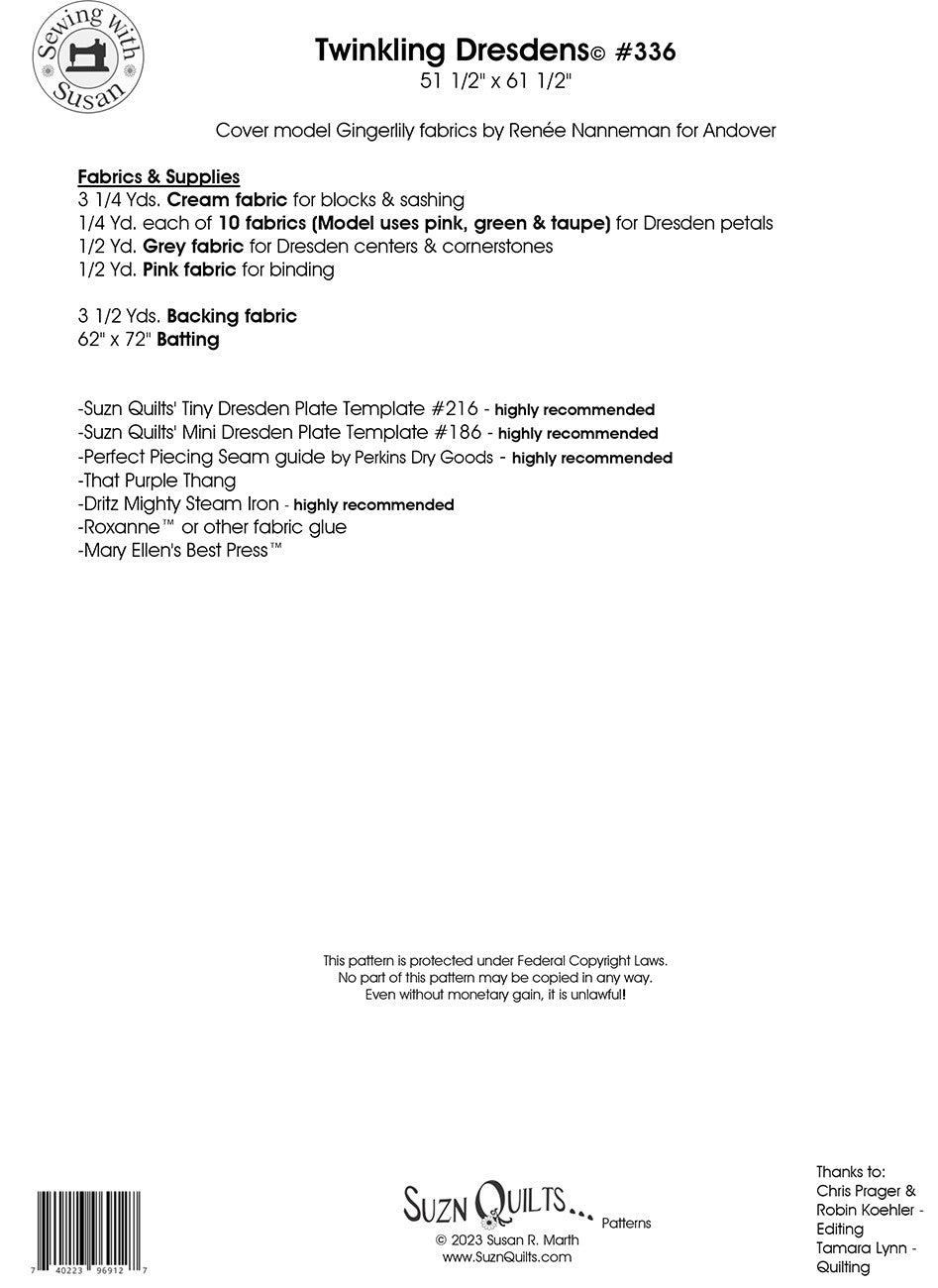 A darling quilt that looks complicated, but is really easy little Dresden petals sewn in a non traditional way. Appliqué by machine with a tiny blind hem stitch makes this quilt quick & fun! Quilt is 51.5" x 61.5". Use with Susan's Mini Dresden SUZ186 & Tiny Dresden SUZ216 Templates for quicker & more accurate cutting.