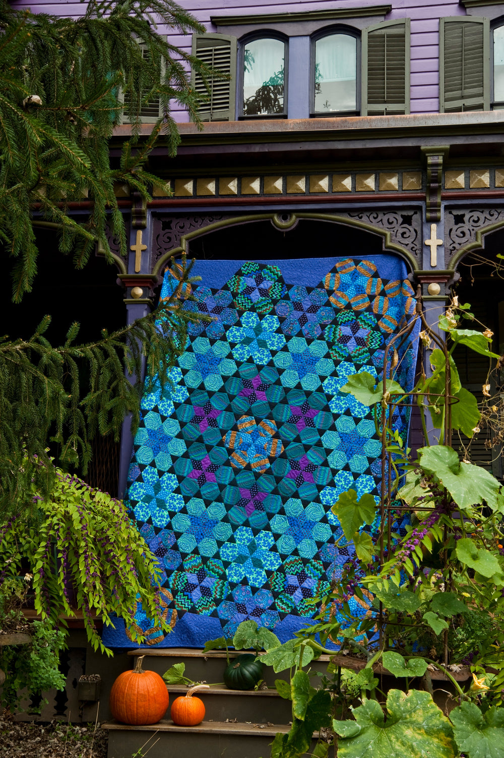 The new designs demonstrate Kaffe's vivid and unique color combinations, giving new meaning to familiar block patterns such as Tumbling Blocks, Starbursts, and Log Cabins.