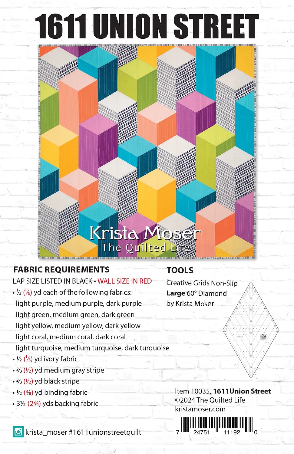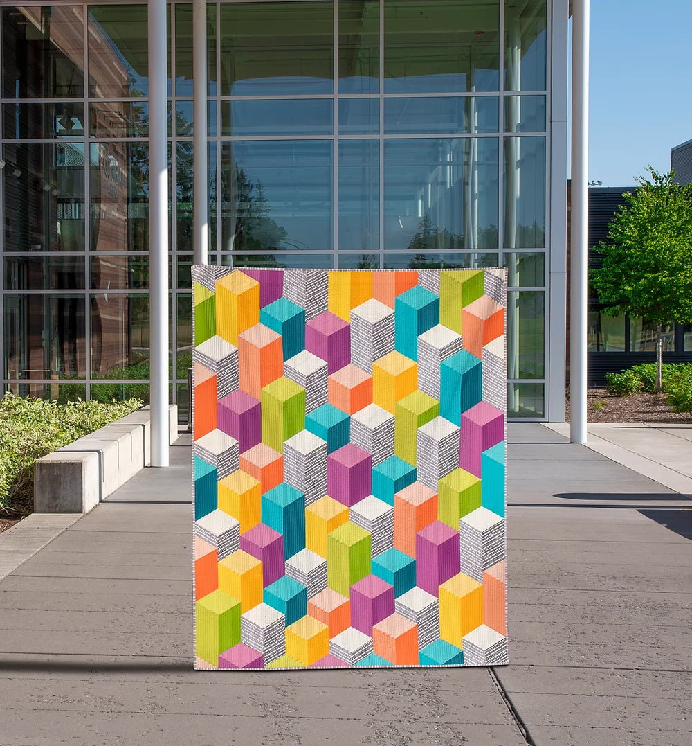 The Union Street quilt is made of fairly large pieces and is deceptively easy to assemble with no Y seams! All the dimensional magic happens with three shades in each color, light, medium, and dark. Choose the building colors, then add the wow factor with striped buildings throughout. Achieve a complicated architectural look without all the fussy piecing. This pattern is fully illustrated at each step with color diagrams for clarity and ease in completion. There are two size layouts included, a lap/twin size and a wall size.