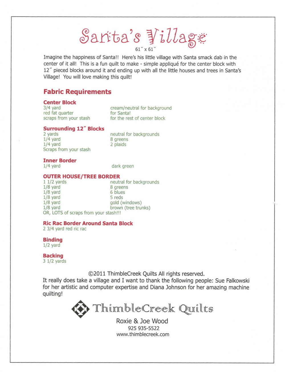 61� x 61� ¢ Imagine the happiness of Santa! Heres his little village with Santa smack dab in the center of it all! This is a fun quilt to make - simple applique for the center block with 12� pieced blocks around it and ending up with all the little houses and trees in Santas Village! You will love making this quilt!