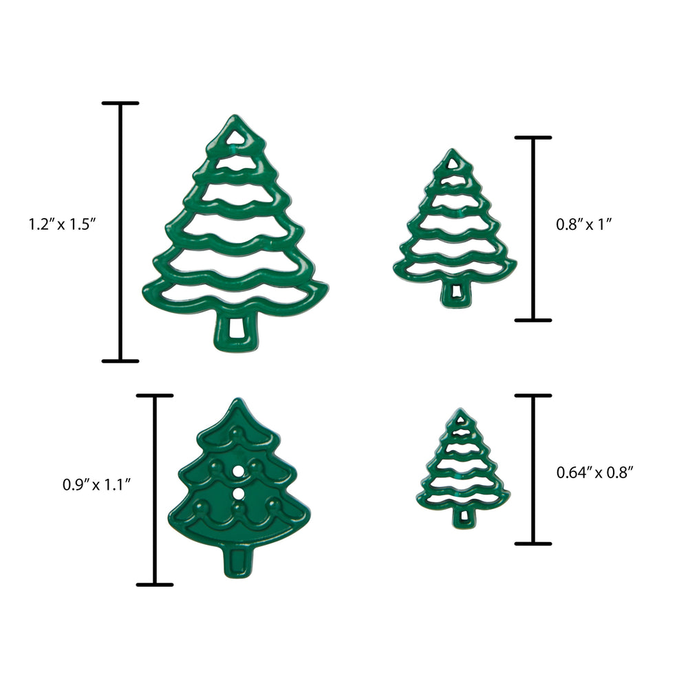 These delightfully decadent buttons come in four sizes. 1.2in x 1.5in, 0.8in x 1in, 0.9in x 1.1in, and 0.64in x 0.8in. They are all 5mm thick.