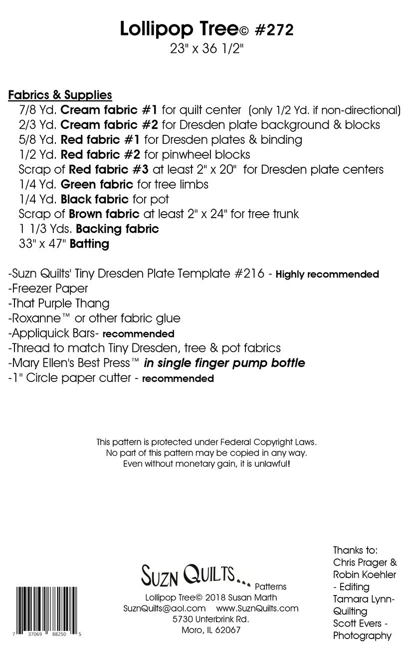23in x 36-1/2in quilt featuring whimsical tree surrounded by pinwheels & Susan's dainty Dresdens. Use with Suzn Quilts' Tiny Dresden Template #216. Expertly written & illustrated instructions for perfect points, precise petal piecing & pressing tips with full-size applique templates.