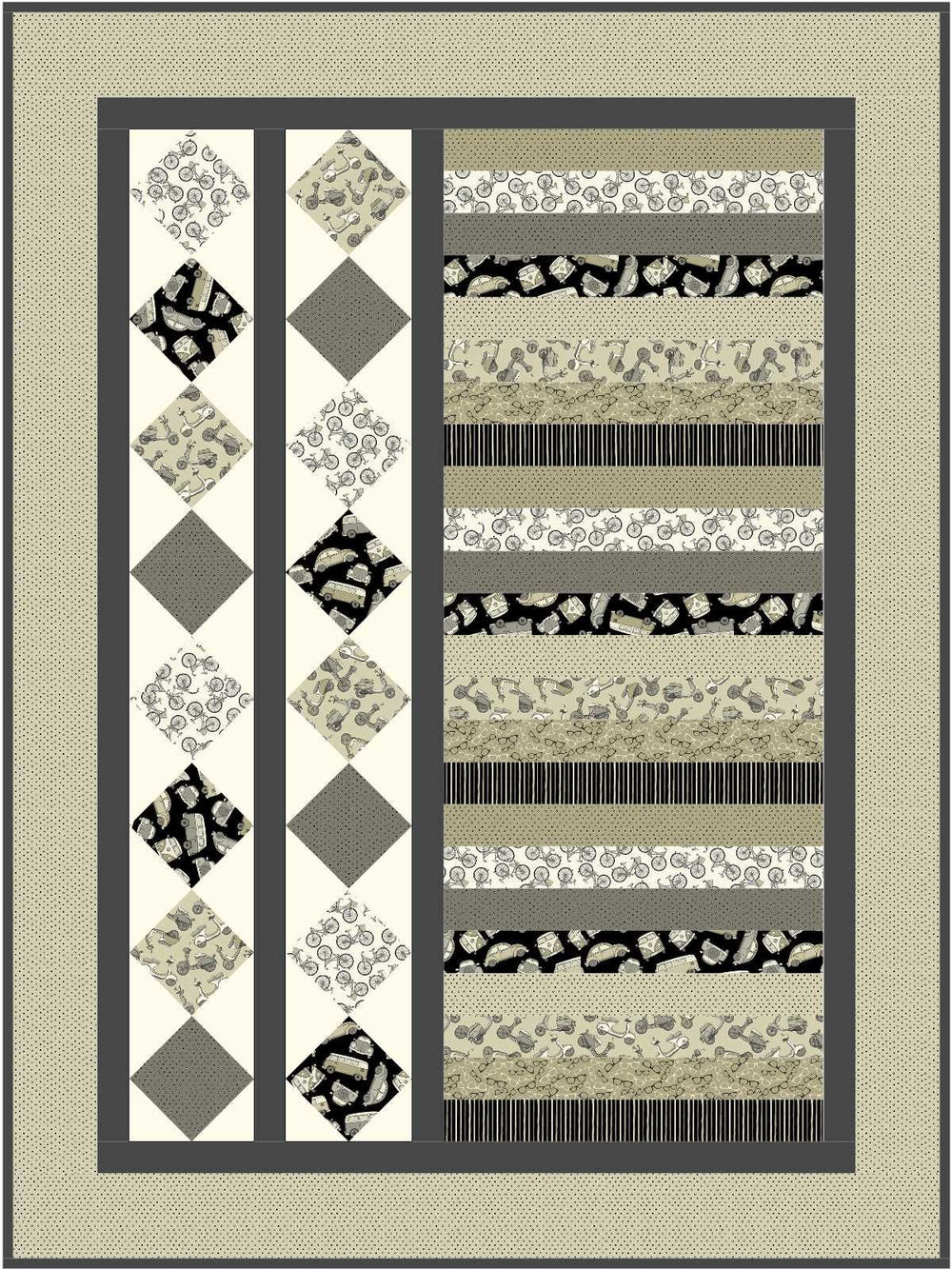 This cute and simple baby quilt was made using the “Hipster On The Go” line of fabric from Northcott. The finished size is 45″ x 60