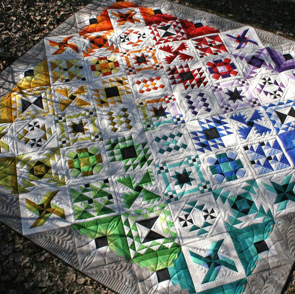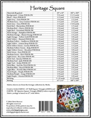 Heritage Square includes two sizes - 103in square and a mini version that is 35in square. The pattern is written so that it can be used as a block of the month for either version. Instructions are for 12 different blocks and requires Creative Grids CGRT45 and CGRT90 rulers.