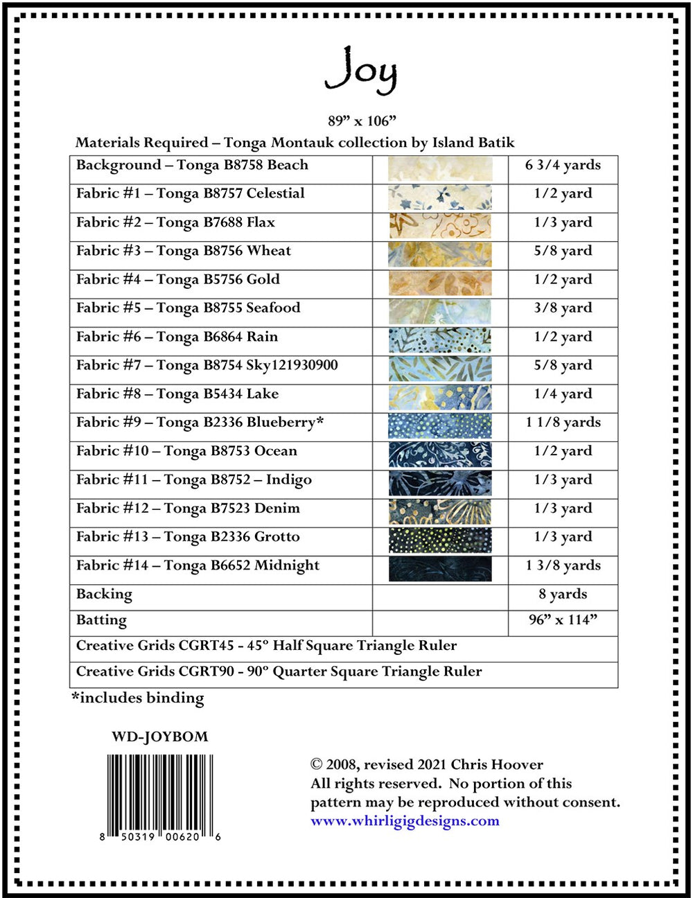Joy is a 12 month Block of the Month with traditional piecing. This 89in x 106in beauty features fabrics from Timeless Treasures' Montauk collection.
