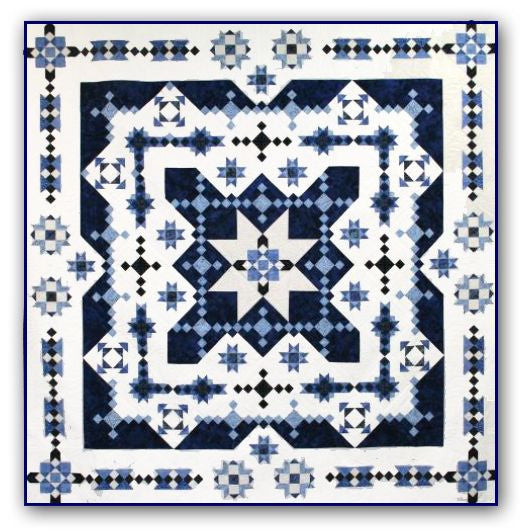 Featuring intricate star-centered details in light and dark blues, this design is perfect for intermediate to advanced quilters.