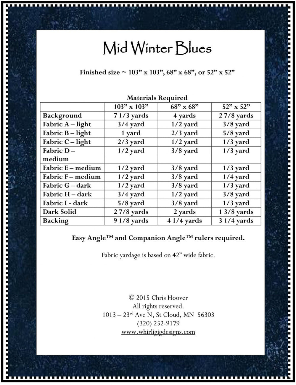 Create a stunning winter-inspired quilt with the Mid Winter Blues pattern by Whirligig Designs.