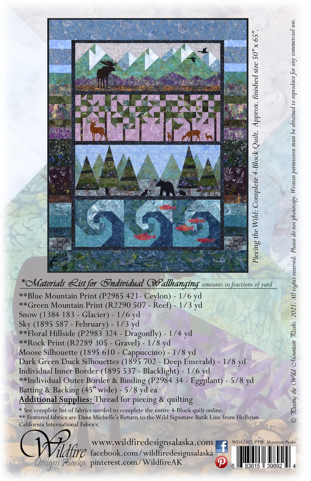 Piece the Wild: Mountain Peaks is a new design by Dana Michelle of Wildfire Designs Alaska. The design features her newest Signature Batik Line, Return to the Wild, with Hoffman California Fabrics. Each pattern includes a set of laser pre-cut silhouette shapes backed with Lite Steam-a-Seam 2 used in the design. The design can be made as an individual wallhanging or combined with the other Piece the Wild patterns. Individual wallhanging finishes 43.5" x 19.5".