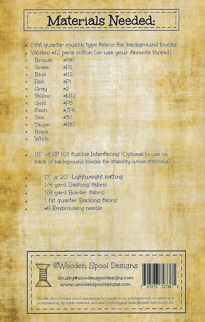 This sweet sewing themed wall hanging is made up of nine 3 1/2" x 4 1/2" embroidered blocks. It measures approx. 15" x 18" finished. These embroidery designs can also be used separate for pincushions, pillow tops, bowl fillers, framed, etc. It can also be done in wool applique!!