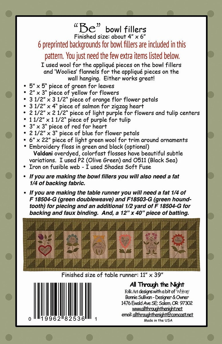 Includes 6 pre-printed background fabrics. Table runner (see pattern back) finished size about 11in x 39in.