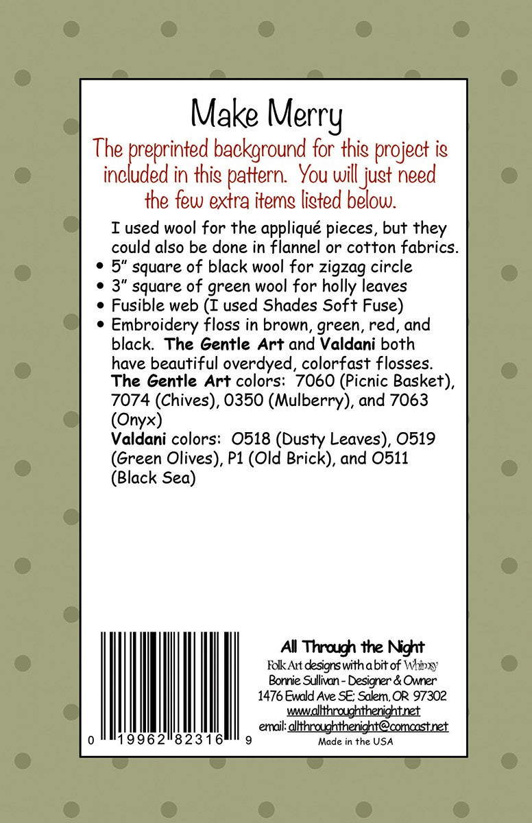 Make Merry (December) will bring cheer to any holiday setting with its sprigs of holly and berries and winter candies. The pre-printed background for this project is included in the pattern. You can use wool for the applique pieces, but they could also be done in flannel or cotton. Finished project will fit an 8in x 10in frame.