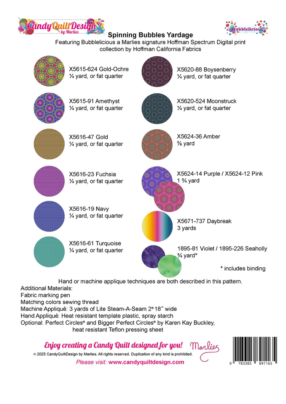 Spinning Bubbles is a vibrant and dynamic quilt that brings movement and depth to your space. Featuring circles appliquéd onto a fussy cut gradient background. The design creates an illusionof playful bubbles overlapping in a fan like arrangement. The quilt can be made by hand or machine appliqué, both methods are described in the pattern. This quilt comes in two colorways. Size: 60 x 60 Featuring Bubblelicious a Marlies signature Hoffman Spectrum Digital print collection by Hoffman California Fabrics