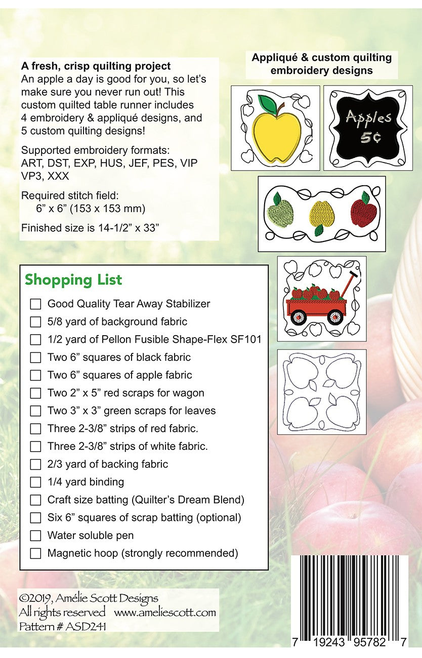 A fresh, crisp quilting project -- An apple a day is good for you, so let’s make sure you never run out! This custom quilted table runner includes 4 embroidery & appliqué designs, and 5 custom quilting designs! Supported embroidery formats: ART, DST, EXP, HUS, JEF, PES, VIP VP3, XXX. Required stitch field: 6” x 6” (153 x 153 mm). Finished size is 14-1/2” x 33”