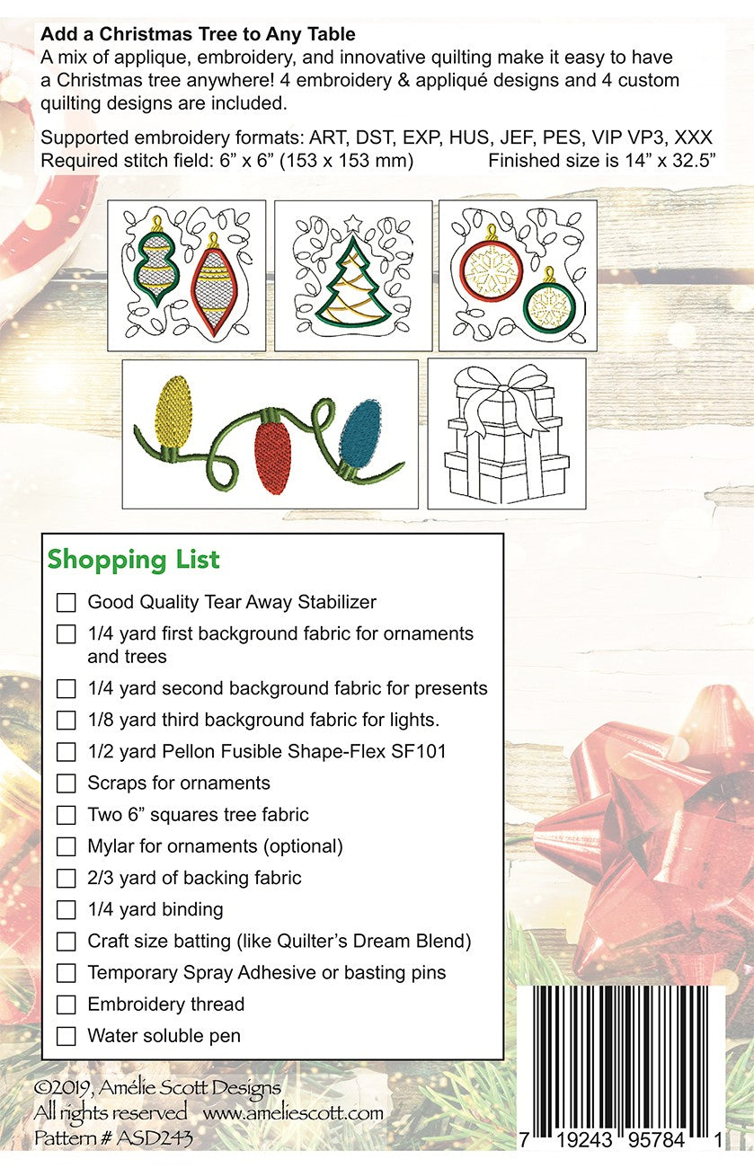 Add a Christmas Tree to Any Table -- A mix of applique, embroidery, and innovative quilting make it easy to have a Christmas tree anywhere! 4 embroidery & appliqué designs and 4 custom quilting designs are included. Supported embroidery formats: ART, DST, EXP, HUS, JEF, PES, VIP VP3, XXX. Required stitch field: 6” x 6” (153 x 153 mm). Finished size is 14” x 32.5”