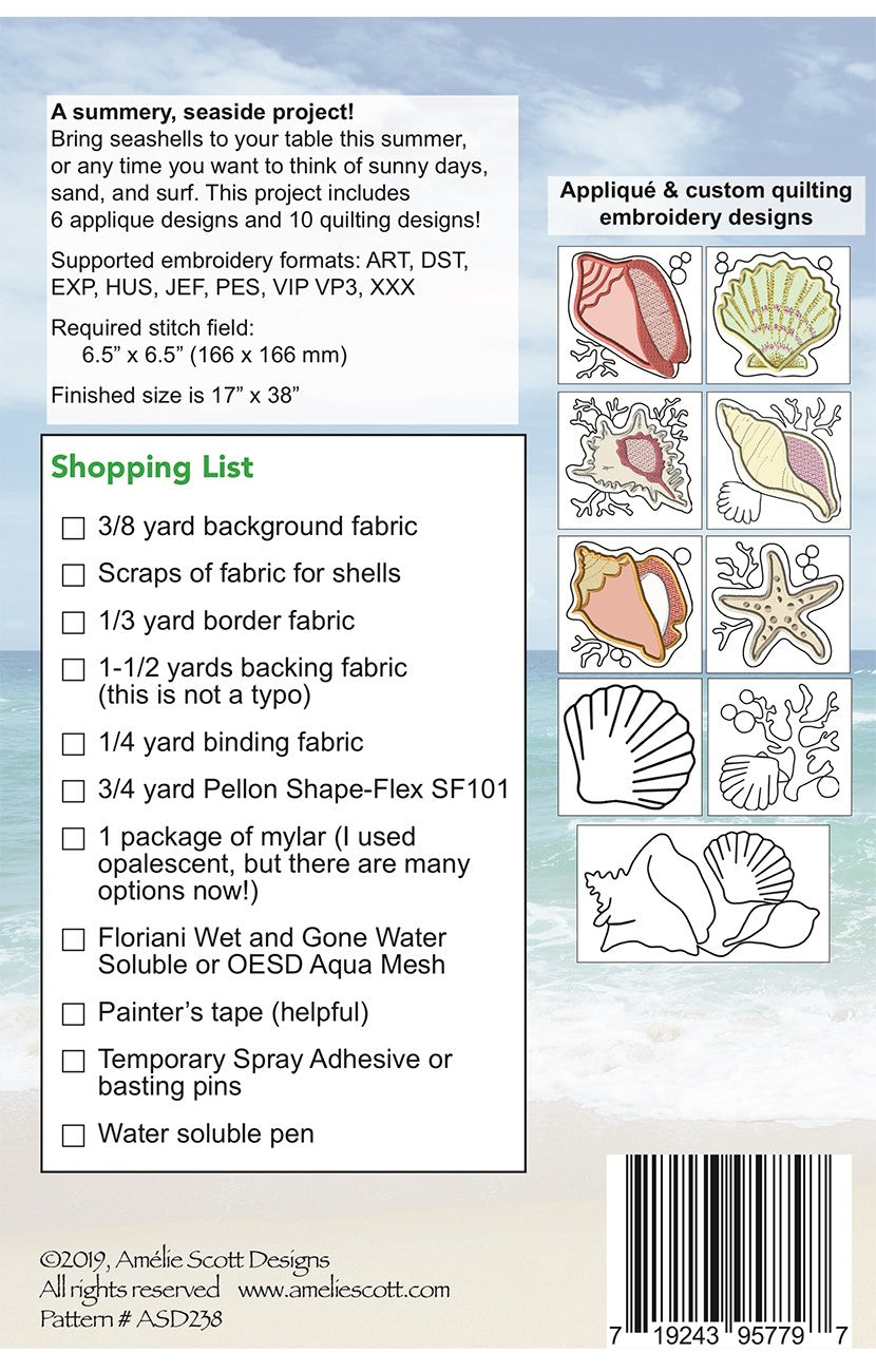 A summery, seaside project! Bring seashells to your table this summer, or any time you want to think of sunny days, sand, and surf. This project includes 6 applique designs and 10 quilting designs! Required stitch field:6.5 x 6.5 inches (166 x 166 mm) Finished size is 17 x 38 inches Supported embroidery formats: ART, DST, EXP, HUS, JEF, PES, VIP VP3, XXX